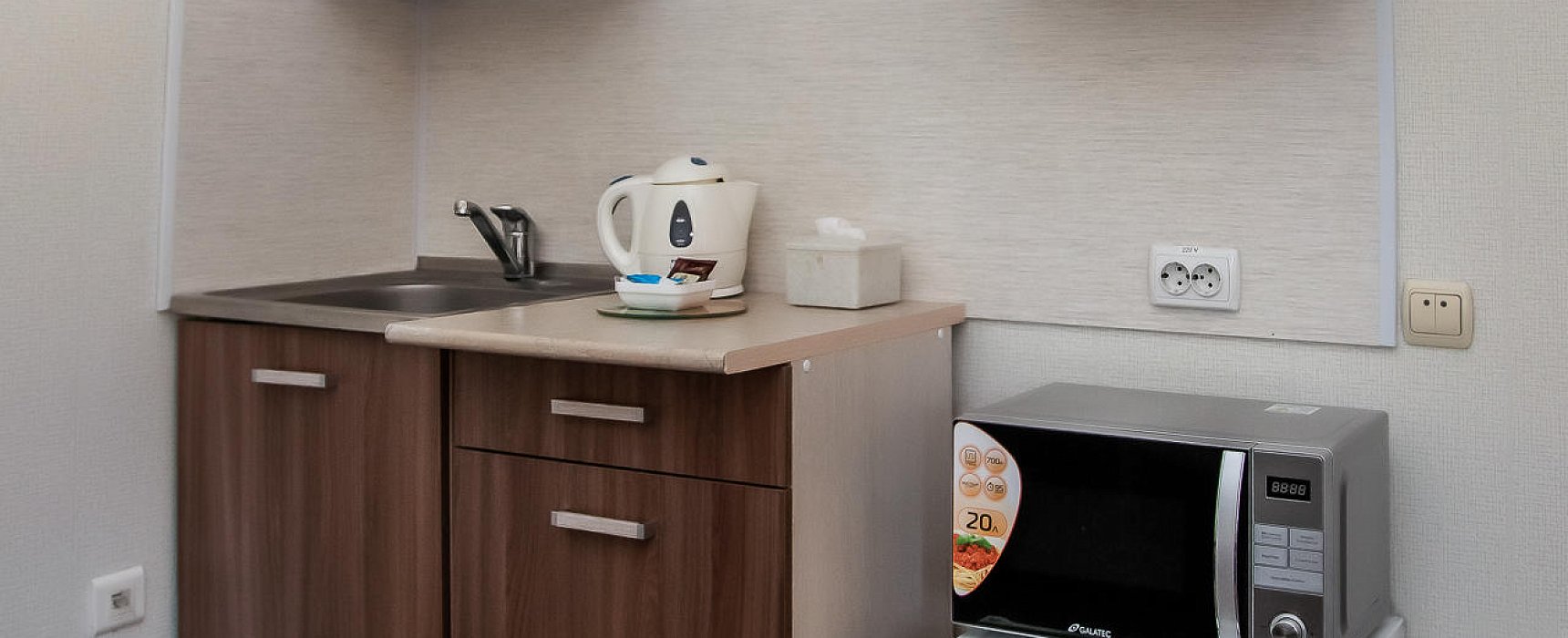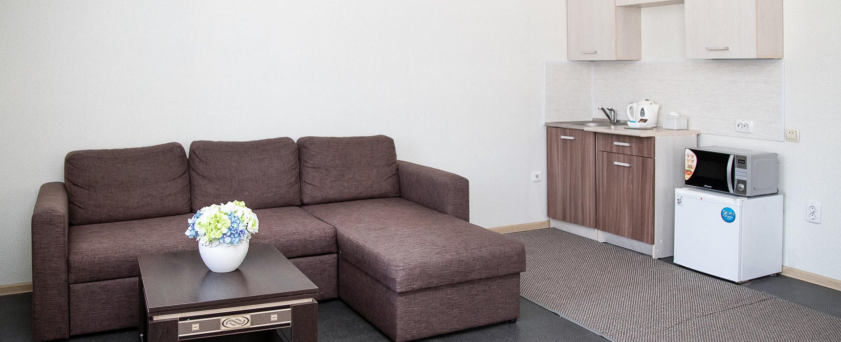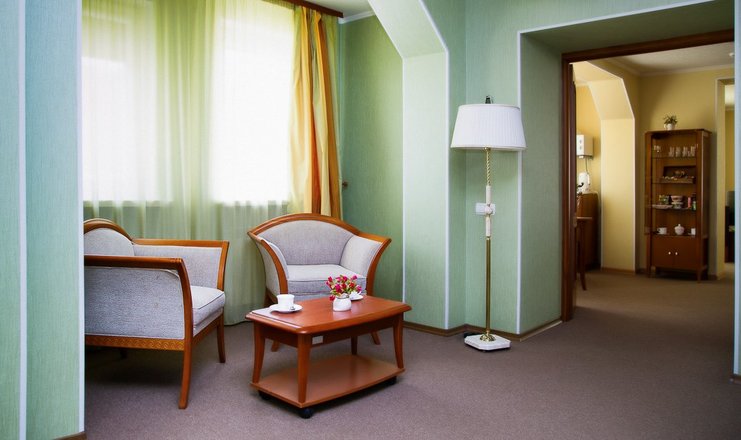 В номере: телевизор, цифровое ТВ, мягкая мебель, кухонная зона, чайник, микроволновая печь, холодильник, мини-бар