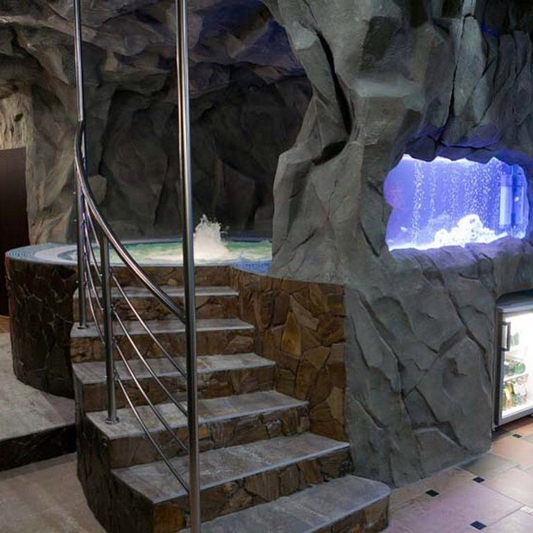Просторный зал с бильярдом, финской сауной, комнатой отдыха и просторной обеденной зоной. Вас ждёт уникальная атмосфера с настоящими скалами, окружающими пещеру, где находится круглый бассейн с гидромассажной установкой и гейзером. Вода поддерживает температуру 30-32°C. Вдоль бассейна расположен аквариум с экзотическими рыбками, создавая фантастический мир дикой природы прямо внутри пещеры: побережье, лазурное море, скалы и удивительные рыбки. Зал "Пещера" обеспечит комфорт для 12 человек (за дополнительную плату возможно больше).