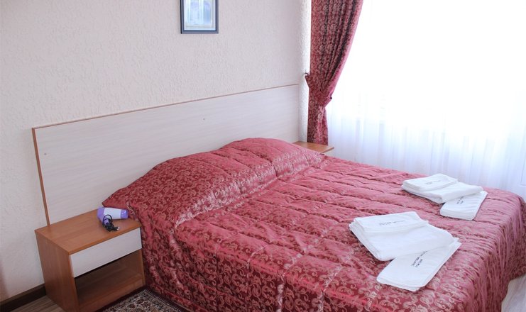 Оснащение номера: двуспальная кровать, прикроватные тумбочки, стол, стулья, шкаф, телевизор, холодильник