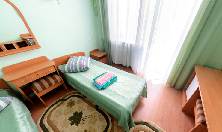 В номере: вешалка, зеркало, кровати односпальные, прикроватные тумбочки, стол, стулья, шкаф встроенный, мини-холодильник, набор посуды, телевизор