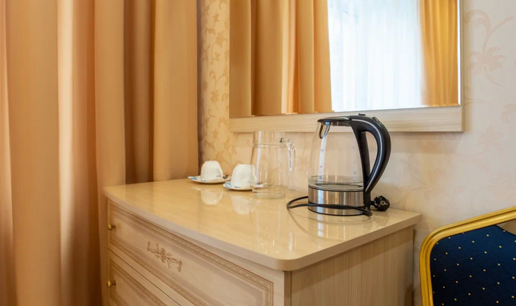 В номере: вешалка, диван раскладной, зеркало, кровать двуспальная, прикроватные тумбочки, стол, стулья, шкаф, телевизор, телефон, холодильник, чайный набор посуды, электрочайник